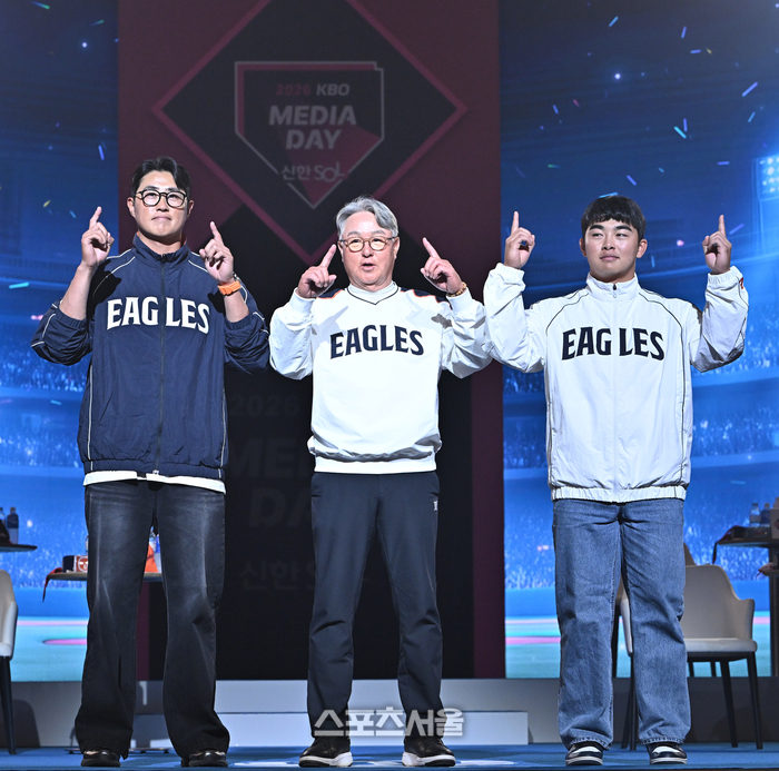한화 채은성(왼쪽)과 김경문 감독(가운데), 문현빈이 26일 서울 송파구 롯데호텔 월드에서 진행된 2026 KBO 미디어데이 행사에서 세리머니를 선보이고 있다. 2026. 3. 26.