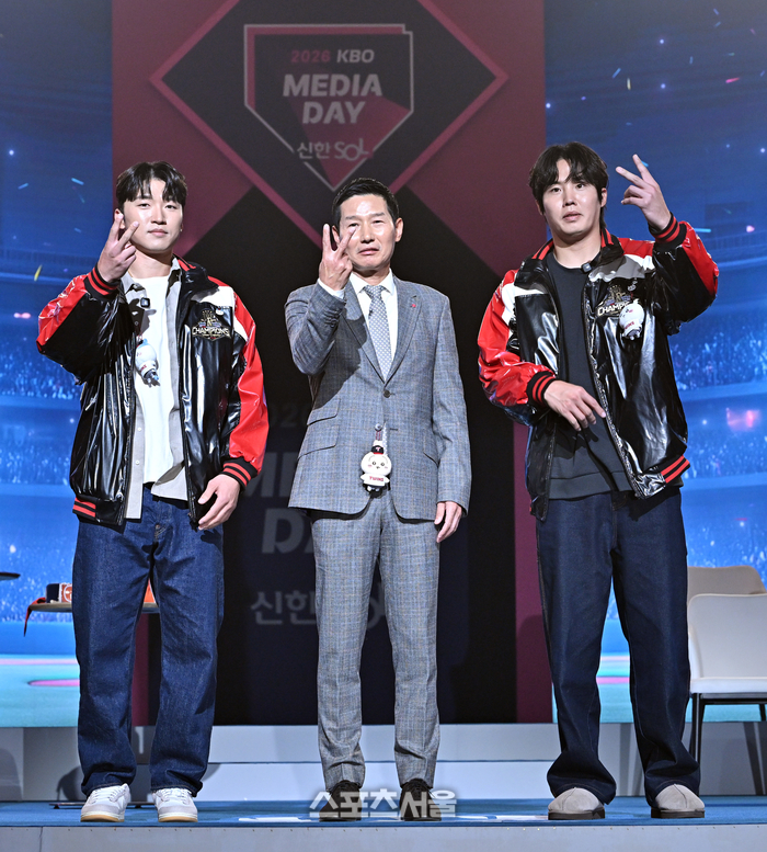 LG 박해민(왼쪽)과 염경엽 감독(가운데), 임찬규가 26일 서울 송파구 롯데호텔 월드에서 진행된 2026 KBO 미디어데이 행사에서 시즌 세리머니를 선보이고 있다. 2026. 3. 26.