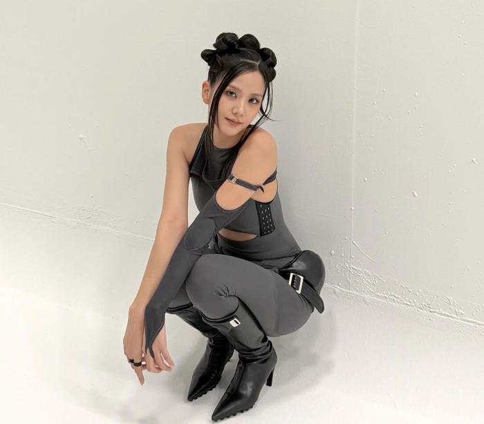 이어지는 사진에서는 이른바 ‘포도 머리’로 불리는 독특한 헤어스타일을 선보였다. 머리카락을 여러 개의 구 모양으로 둥글게 말아 올린 스타일로, 자칫 소화하기 어려운 실험적인 시도임에도 불구하고 지수의 뚜렷한 이목구비와 조화를 이뤘다.