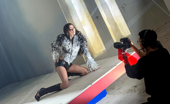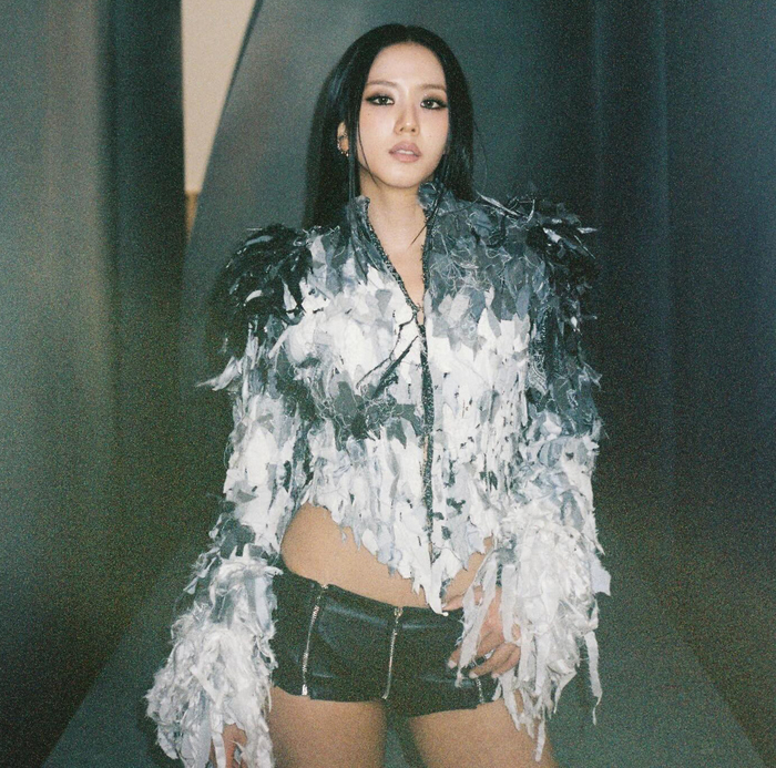 가장 먼저 눈길을 끄는 것은 지수가 직접 ‘까마귀 옷’이라 지칭한 상의다. 흑색과 백색의 깃털 소재가 거칠게 레이어드된 이 의상은 마치 날개를 형상화한 듯한 디자인으로 지수 특유의 차분하면서도 강렬한 눈빛과 어우러져 신비로운 분위기를 자아낸다.