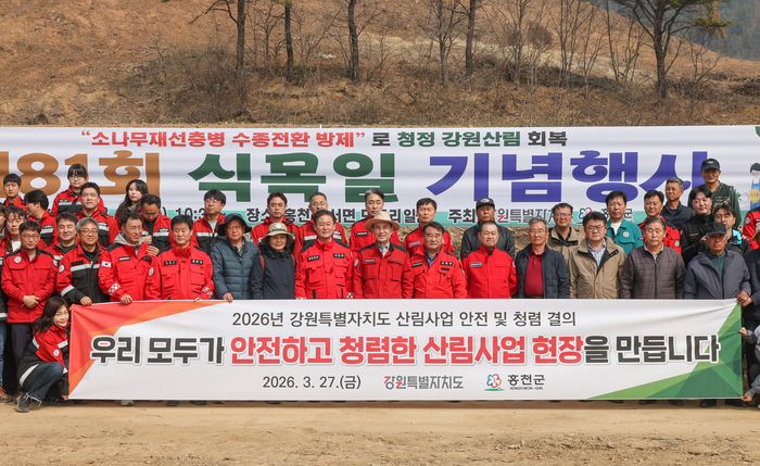 [스포츠서울ㅣ춘천=김기원 기자]강원특별자치도는(도지사 김진태) 27일(금) 홍천군 서면 모곡리 796-1번지 일원에서 김진태 도지사를 비롯해 도의회, 홍천군, 산림조합, 임업인 단체, 마을주민 등 150여 명이 참석한 가운데 제81회 식목일 기념행사를 개최했다.