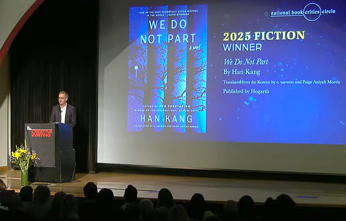 전미도서비평가협회는 26일(현지시간) 미국 뉴욕에서 열린 ‘2025년 출간 도서 시상식’에서 이예원과 페이지 모리스가 번역한 한강의 장편소설 <작별하지 않는다>(영어제목 ‘We Do Not Part’)를 소설 부문 최종 수상작으로 선정했다고 발표했다.