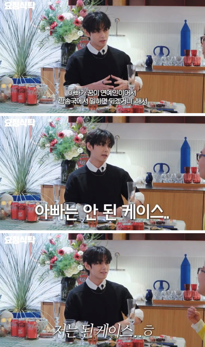 뷔는 “나중에 알게 된 건데 아버지도 연예인이 꿈이었다. 탤런트를 준비했고 대구 MBC에서 FD로 일하기도 했다”며 “방송국에서 일하다 보면 기회가 올 거라 생각했지만 안 된 케이스, 전 된 케이스”라고 말해 웃음을 자아냈다.