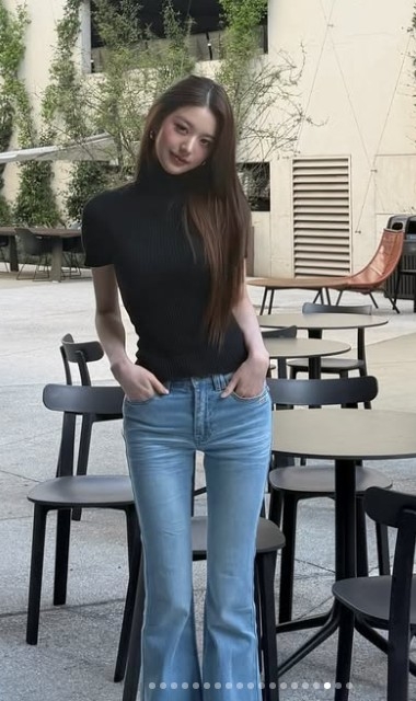 편안한 스타일인데도 가늘고 긴 다리, 작은 얼굴, 긴 상체와 하체 비율이 먼저 시선을 끌었다. 마네킹 같은 분위기다.