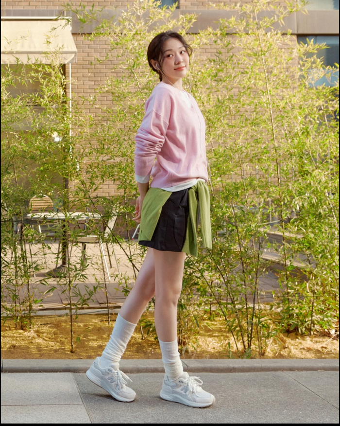 또 다른 사진 속 김연아는 핑크색 니트와 짧은 하의, 운동화를 착용하고 벤치에 앉아 청초한 매력을 발산했다. 자연스러운 헤어스타일과 은은한 미소는 김연아 특유의 우아한 면모를 더욱 돋보이게 했다.