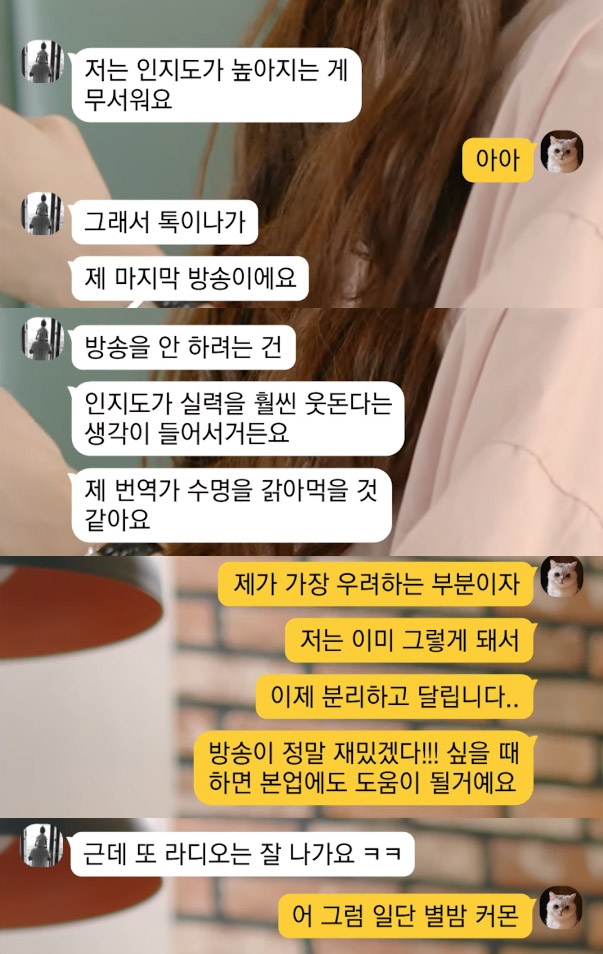 영상의 뒷부분에도 황석희는 “인지도가 높아지는 게 두렵다”며 “그래서 ‘톡이나’가 마지막 방송”이라며 첫 방송에서 은퇴를 선언했다. 이어 “방송을 안 하려는 이유는 인지도가 내 실력을 훨씬 웃돈다는 생각이 들고 내 번역가 수명을 갉아 먹을 것 같다”고 설명을 덧붙였다. 이에 비슷한 직업의 작사가인 김이나는 큰 한숨과 함께 공감까지 했고 “라디오에는 잘 나간다”는 황석희의 말에 자신이 진행하는 라디오 ‘별밤’ 섭외까지 하며 반겼다.