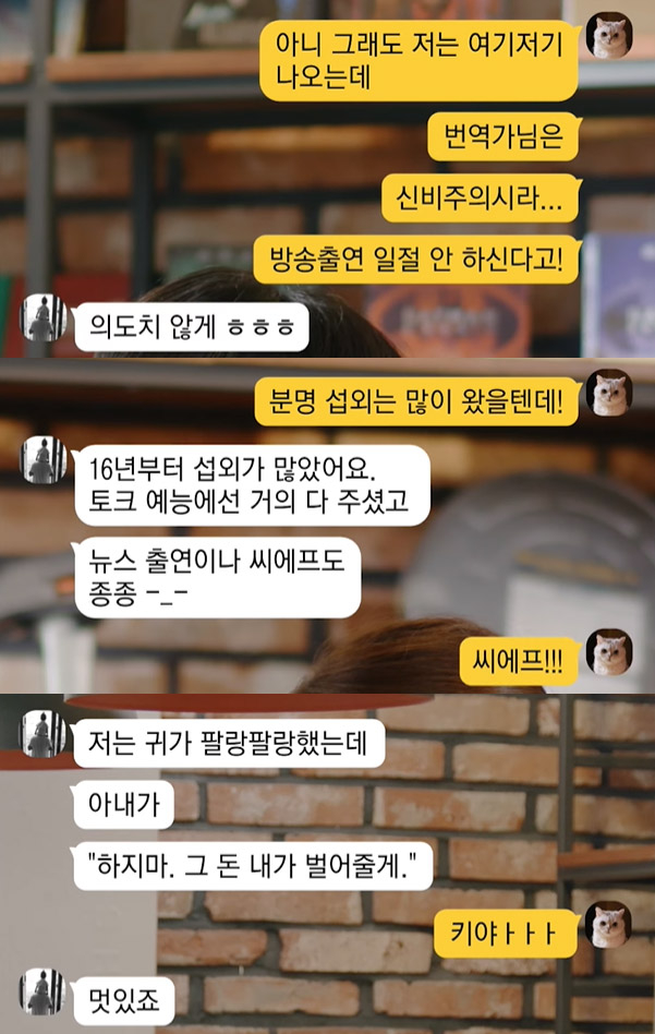 이어 황석희는 “저는 귀가 팔랑팔랑 했는데 아내가 ‘그 돈 내가 벌어줄게’ 했다”면서 같은 번역가로 활동하고 있는 아내를 “멋있다”고 자랑했다. 이어 아내를 “저보다 더 유능한 번역가”로 소개했다.