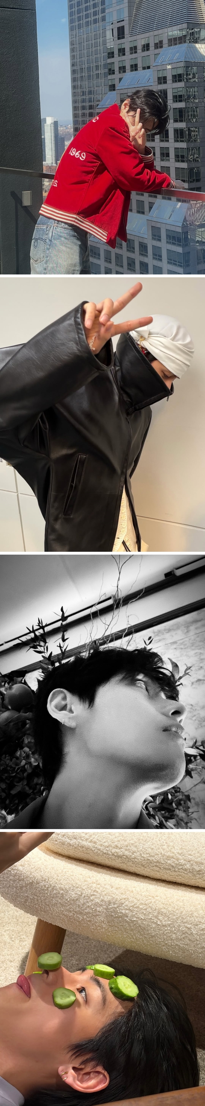 가죽재킷을 입고 브이 포즈를 취한 컷에서는 시크한 매력을 보여줬고, 오이를 얼굴에 올린 사진에서는 힘을 뺀 일상미로 웃음을 자아낸다.