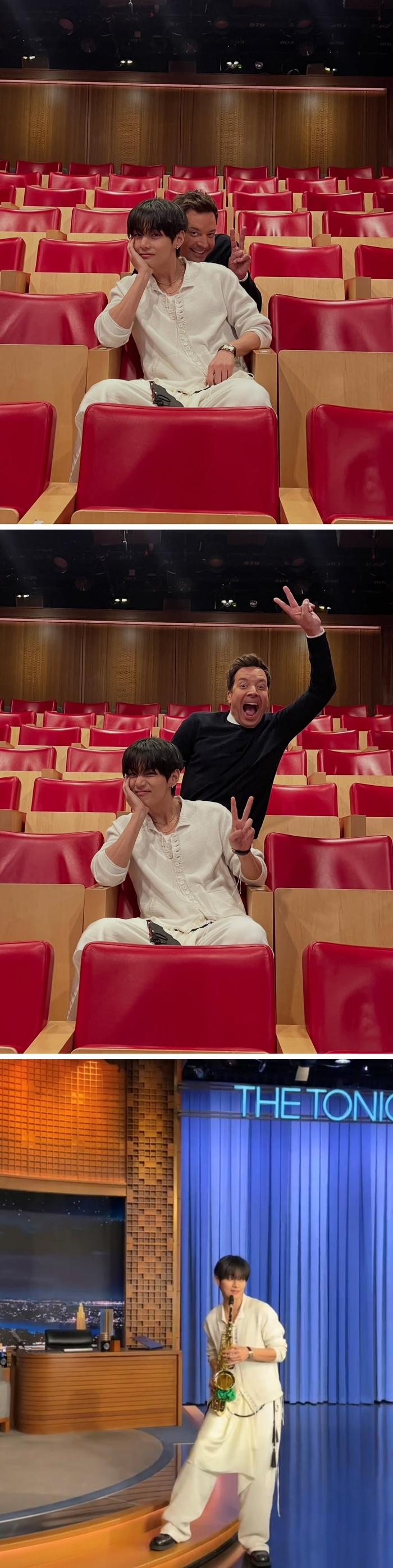 미국 활동 비하인드도 포함됐다. 뷔는 지난 26~27일 미국 NBC ‘더 투나잇 쇼 스타링 지미 팰런’에 출연했을 당시의 스튜디오 사진도 함께 공개했다. 색소폰을 연주하는 모습과 진행자 지미 팰런과 함께 찍은 사진이 시선을 끌었다.