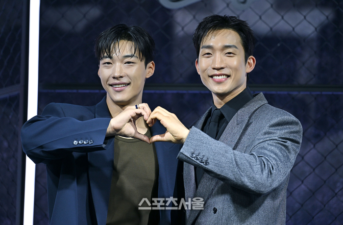 우도환(왼쪽)과 이상이가 31일 앰배서더 서울 풀만 호텔에서 열린 넷플릭스 시리즈 ‘사냥개들 시즌2’ 제작발표회에서 포즈를 취하고 있다.