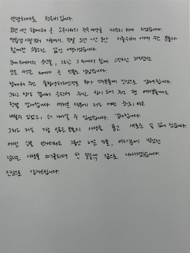 이어 “항상 곁에서 응원해 주시고 힘이 되어 주신 팬 여러분들께도 정말 감사하다”며 “여러분 덕분에 저는 어떤 순간이 와도 버틸 수 있었고, 더 나아갈 수 있었다. 그리고 저는 지금 많은 분들의 사랑을 품고 새로운 길 앞에 섰다. 어떤 길을 만나더라도 그동안 배운 것들, 여러분께 받았던 넘치는 사랑을 떠올리며 한 걸음씩 앞으로 나아가겠다”고 덧붙였다.