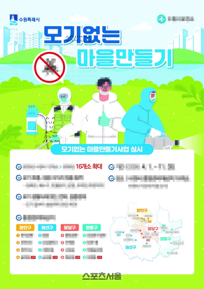 〔스포츠서울│수원=좌승훈기자〕경기 수원시는 올해 ‘모기 없는 마을만들기’ 사업 대상지를 16곳으로 확대 운영한다.