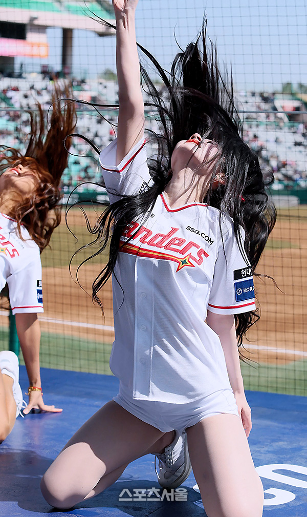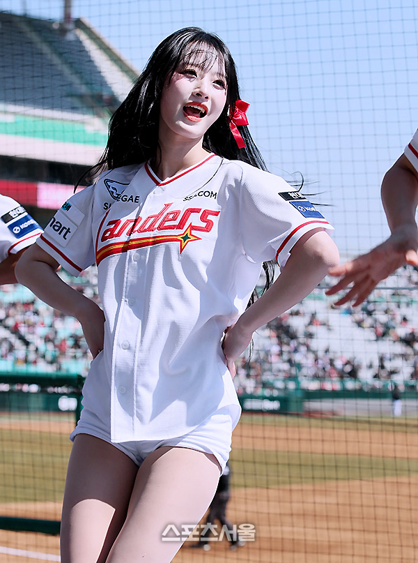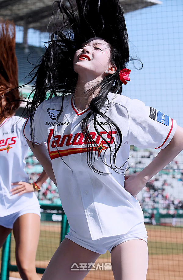 새하얀 피부로 소문난 그다. 심지어 별명이 ‘찰떡 공주’. 시범경기 SSG와 키움의 경기에서 SSG 치어리더 정설아가 신나는 안무 공연을 선보이고 있다.