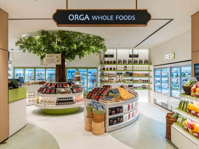 매장은 공간 브랜딩 기업 ‘글로우 서울’에서 설계를 맡았다. 중앙에는 나무 오브제를 배치해 매장을 둘러볼 수 있는 동선을 적용했다. 또한 상품은 원료부터 식탁까지의 흐름에 따라 진열했다.