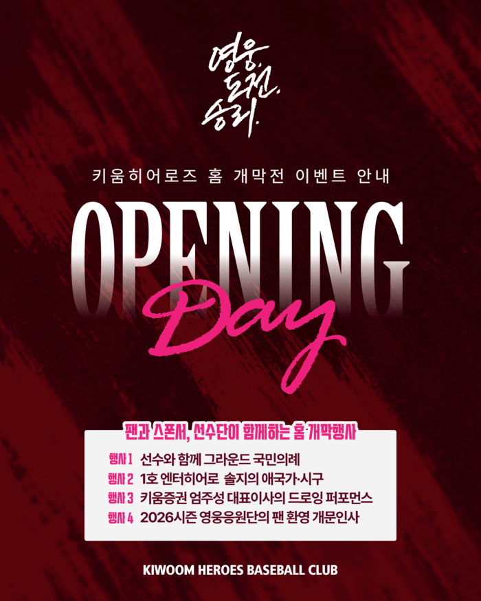 키움은 이번 홈 개막 행사 타이틀을 올 시즌 캐치프레이즈인 ‘영웅, 도전, 승리.’로 정했다. 팬과 스폰서, 선수단이 함께 하는 행사로 꾸민다. 키움 사랑하고 응원하는 모든 구성원이 하나 되어 올 시즌 도전을 함께하고 승리를 향해 나아가겠다는 의미를 담았다.