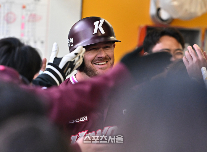 키움 브룩스가 1일 문학구장에서 열린 2026 KBO리그 SSG와의 경기 1회초 무사 1루 이주형의 2루타에 득점을 한 뒤 동료들과 하이파이브를 하고 있다. 2026. 4. 1.