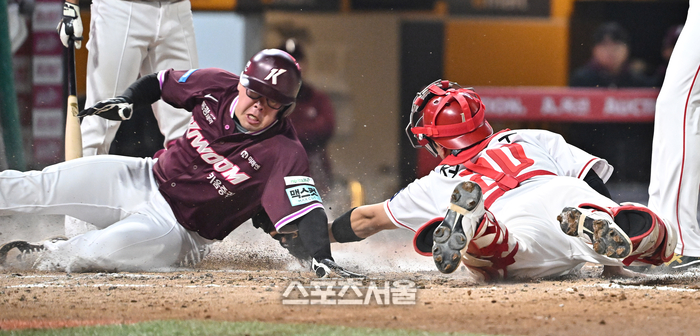키움 안치홍(왼쪽)이 1일 문학구장에서 열린 2026 KBO리그 SSG와의 경기 5회초 2사 3루 상황에서 SSG 선발 타케다의 폭투에 홈으로 파고들어 포수 조형우의 태그를 절묘하게 피하면서 득점을 하고 있다. 2026. 4. 1.
