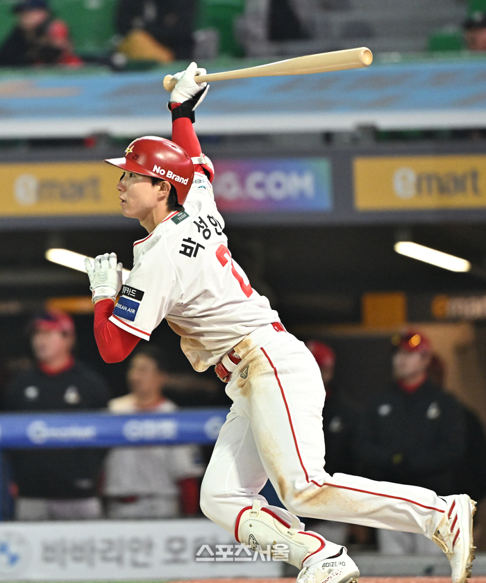 SSG 박성한이 2일 문학구장에서 열린 2026 KBO리그 키움과의 경기 3회초 무사 2루 상황에서 키움 선발 정현우를 상대로 1타점 2루타를 치고 있다. 2026. 4. 2.