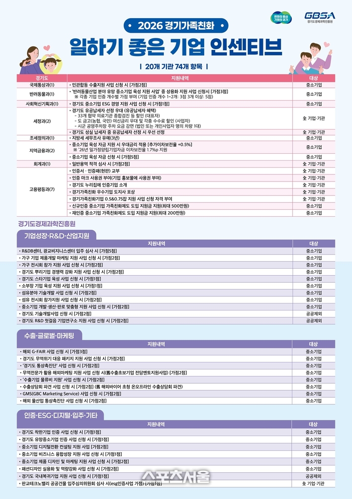 올해는 ‘4.5일제 지원 사업’과 주 20시간(0.5잡), 주 30시간(0.75잡) 형태의 단축근무를 지원하는 ‘경기가족친화기업 0.5&0.75잡 지원 사업’ 참여 기업에 가점을 부여해 일‧생활 균형 정책을 적극 실천하는 기업을 우대할 계획이다.