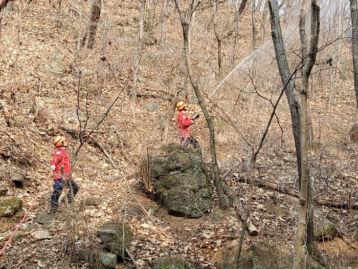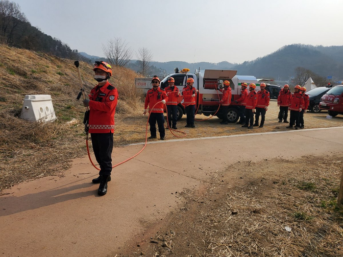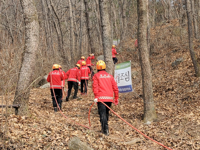 현장에는 공무원과 산불감시원, 이·통장 등 가용가능한 모든 인력을 산불 취약지에 집중 배치한다. 감시원과 진화대의 근무 시간도 기존 오후 6시에서 7시까지로 연장 조정하며, 본청 진화대 신속대기조는 밤 10시까지 운영해 초동 진화 태세 유지 및 현장 대응력을 최상으로 유지하기 위해 주기적 자체 산불진화 훈련을 강화하고 있다