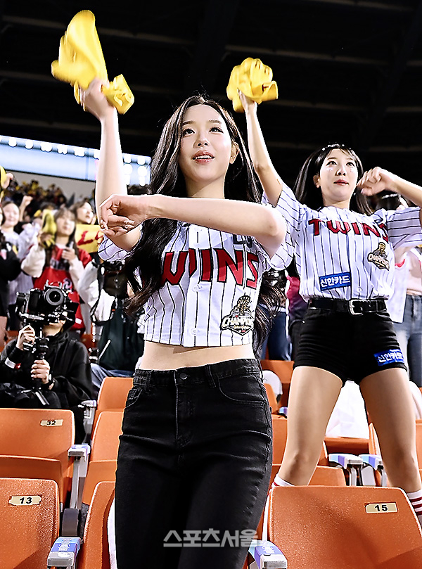 LG와 KIA의 잠실 경기 시구는 트리플에스 김채연이었다. 멋진 시구를 마친 그는 응원단상 무대에 올라 LG 치어리더들과 함께 스페셜 치어리딩을 선보이기도.