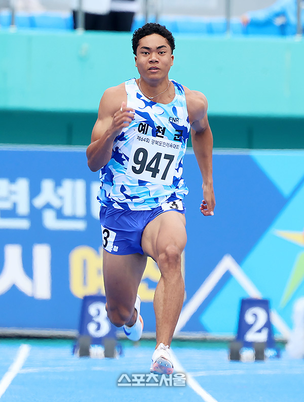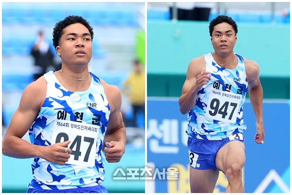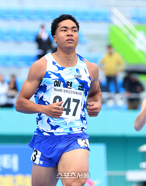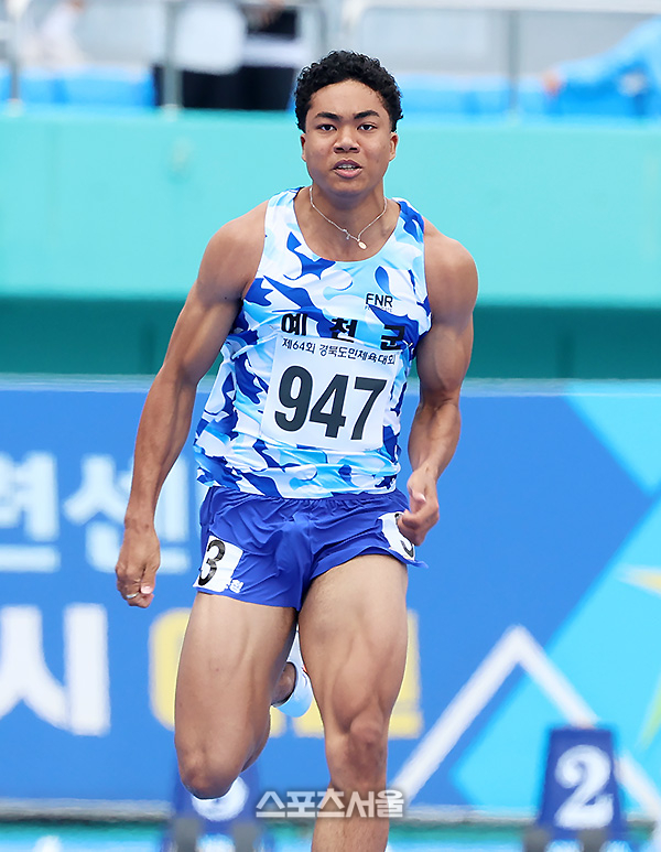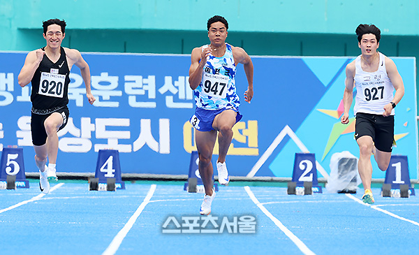 예천군청 나마디 조엘진이 4일 오후 경상북도 예천군 예천스타디움에서 열린 ‘제64회 경북도민체육대회’ 육상 군남일반부 100m 결승에서 10초59로 금메달을 목에 걸었다.