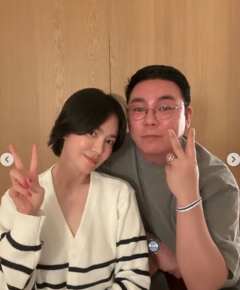 공개된 사진에는 송혜교가 팔짱을 끼며 해당 스타일리스트 옆에서 미소 짓고 있는 모습이 담겼다. 또 다른 사진에서 두 사람을 손가락으로 브이를 그리며 웃고 있다.