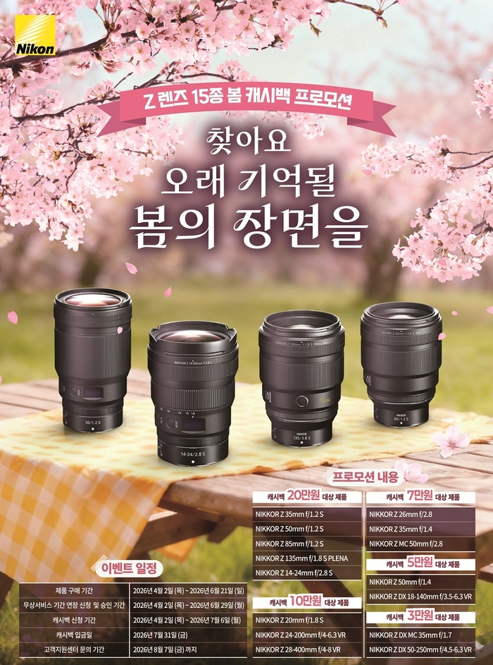 [스포츠서울 | 표권향 기자] 니콘이미징코리아가 봄 출사 시즌을 맞아 NIKKOR Z 렌즈 구매 고객을 대상으로 ‘Z렌즈 15종 봄 캐시백 프로모션’을 진행한다.