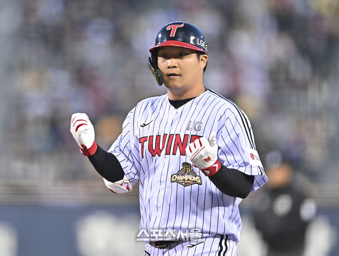 9회초. 한 점을 더 달아났다. 문보경이 주인공이다. 선두타자로 나서 상대투수 정다훈의 초구를 노렸다. 시속 151㎞ 속구를 힘있게 때려 가운데 담장을 넘겼다. 5-1이다. 여기서 오지환의 적시타까지 터지며 6-1로 벌렸다.
