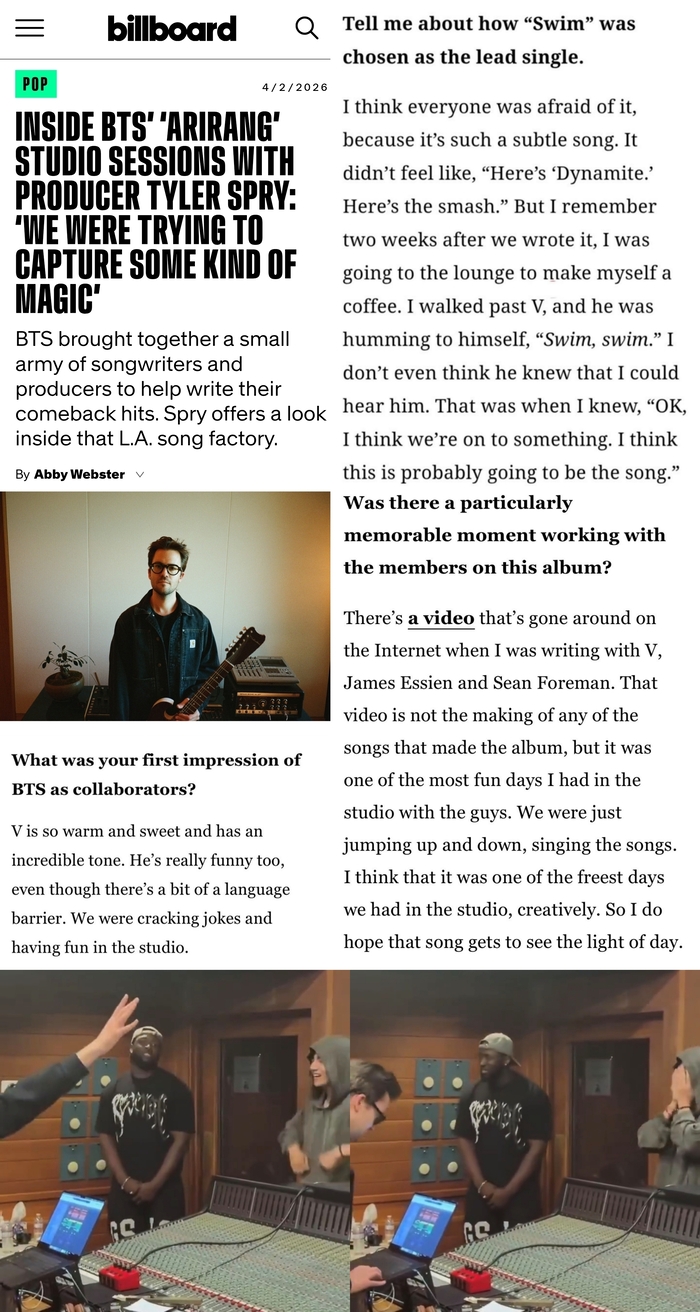 방탄소년단 정규 5집 ‘아리랑’에 참여한 미국 프로듀서 타일러 스프라이는 최근 인터뷰에서 앨범 제작 과정을 공개했다.