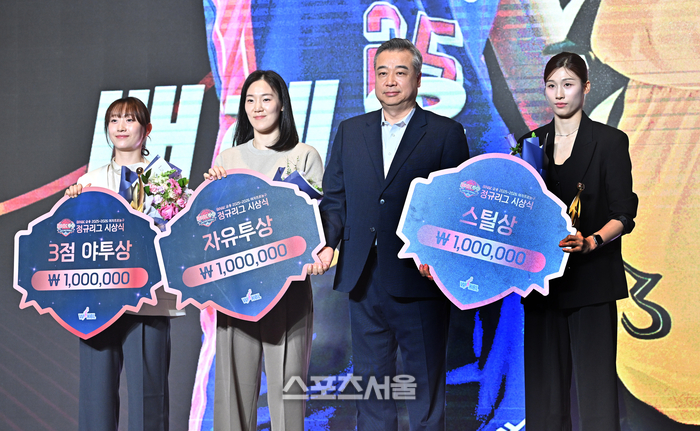 생KB스타즈 이채은과 삼성며 배혜윤, 이해란이 6일 서울 용산구 서울드래곤시티 그랜드볼룸에서 열린 BNK금융 2025-2026 여자프로농구 정규리그 시상식에서 각 각 3점 야투상과 자유투상, 스틸상을 받은 뒤 시상자인 제일기획 임근배 단장과 기념촬영을 하고 있다. 2026. 4. 6.