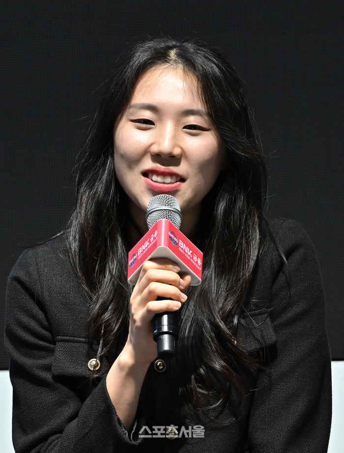 삼성생명 강유림이 6일 서울 용산구 서울드래곤시티 그랜드볼룸에서 열린 BNK금융 2025-2026 여자프로농구 포스트시즌 미디어데이 행사에서 사회자의 질문에 답을 하고 있다. 2026. 4. 6.