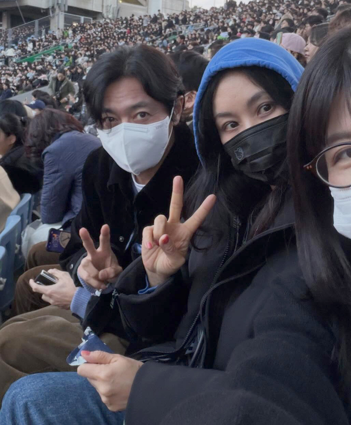 공개된 사진 속 고소영·장동건 부부는 마스크를 착용한 채 관람석에 나란히 앉아 다정하게 ‘브이(V)’ 포즈를 취하고 있다.