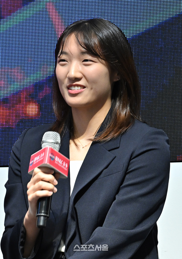 하나은행 정예림이 6일 서울 용산구 서울드래곤시티 그랜드볼룸에서 열린 BNK금융 2025-2026 여자프로농구 포스트시즌 미디어데이 행사에서 사회자의 질문에 답을 하고 있다. 2026. 4. 6.