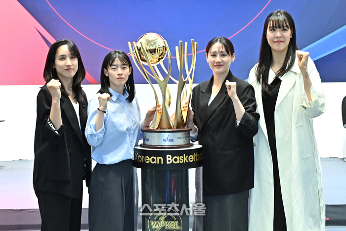 6일 서울 용산구 서울드래곤시티 그랜드볼룸에서 열린 BNK금융 2025-2026 여자프로농구 포스트시즌 미디어데이 행사에서 각 팀 선수들이 기념촬영을 하고 있다. 왼쪽부터 우리은행 김단비, 강계리, KB스타즈 강이슬, 박지수. 2026. 4. 6.