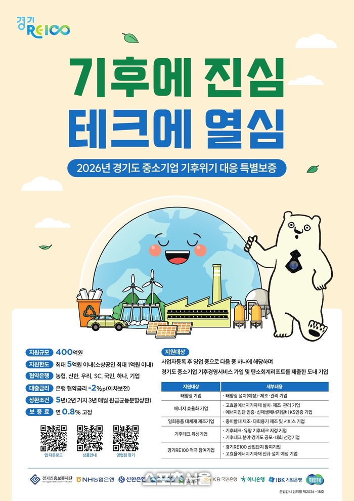 7일 도에 따르면 특별보증 주요 지원 대상은 태양광 및 에너지 효율화 기업, 일회용품 대체재 제조 기업, 기후테크 육성 기업, 그리고 경기RE100 참여 기업 등 미래 성장 동력을 갖춘 기후 관련 기업들이다. 선정된 기업은 업체당 최대 5억 원 한도 내에서 보증 지원을 받을 수 있다.