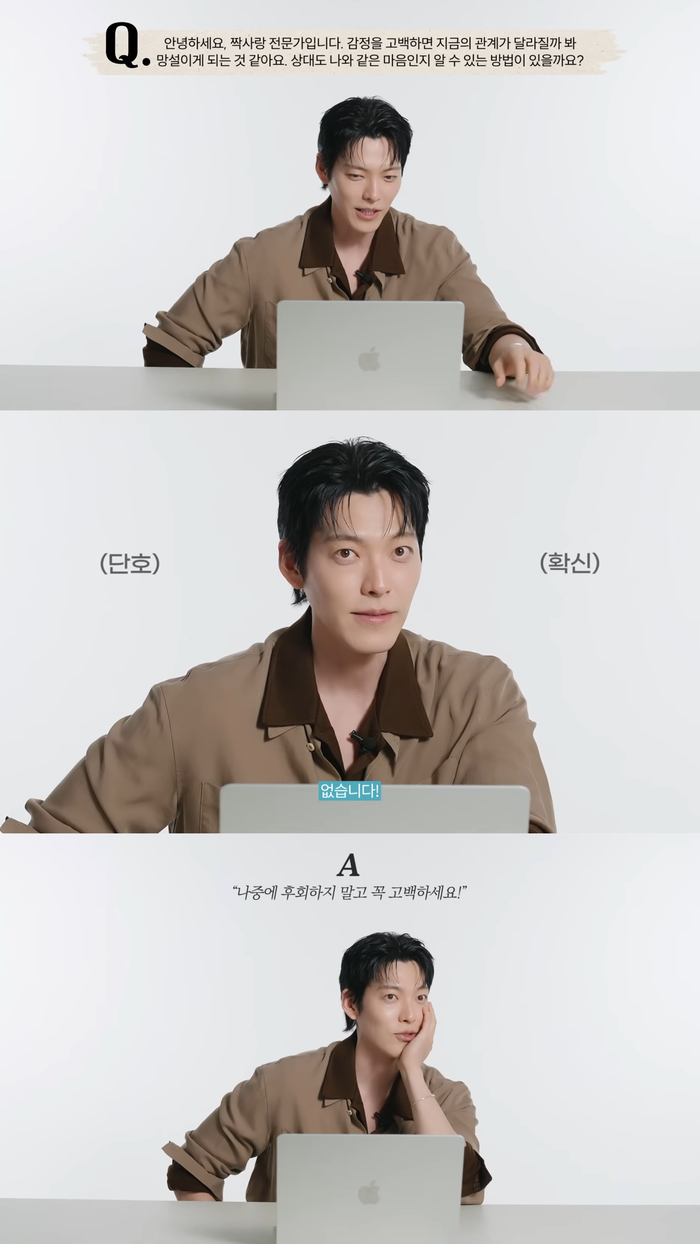 이에 김우빈은 “없습니다”라고 단호하게 말했다. 그는 “개인적인 생각은 짝사랑만 하다가 시기를 놓치는 것보다, 차라리 마음을 고백하면 덜 후회될 것 같다”고 말했다. 그러면서 “고백도 못 하고 기회가 없어지면 너무 후회될 거 같다”고 덧붙였다.