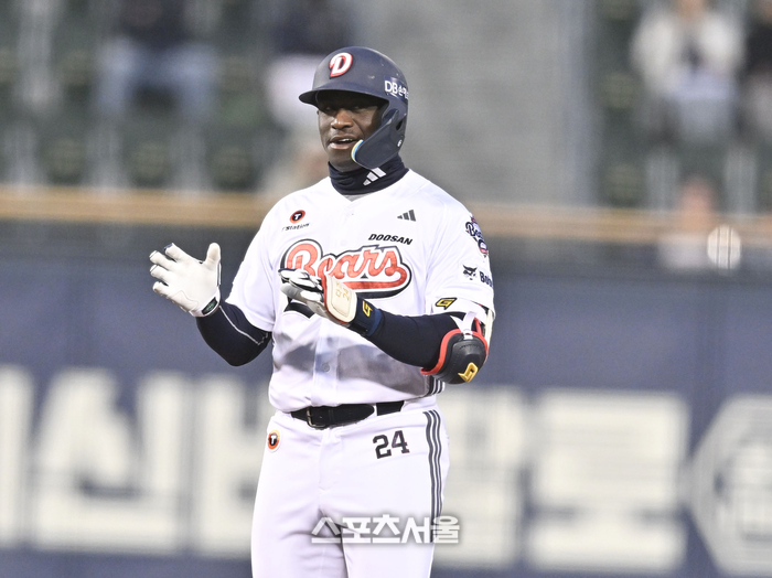 두산 카메론이 7일 서울 잠실구장에서 열린 2026 KBO리그 키움전 2회말 1사 우중간 2루타를 친 후 세리머니를 하고 있다.