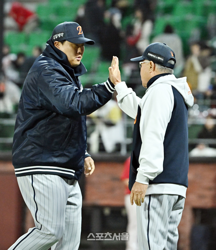 한화 류현진이 7일 문학구장에서 열린 2026 KBO리그 SSG와의 경기에서 6이닝 2실점으로 시즌 첫 승을 거둔 뒤 김경문 감독과 하이파이브를 하고 있다.2026. 4. 7.