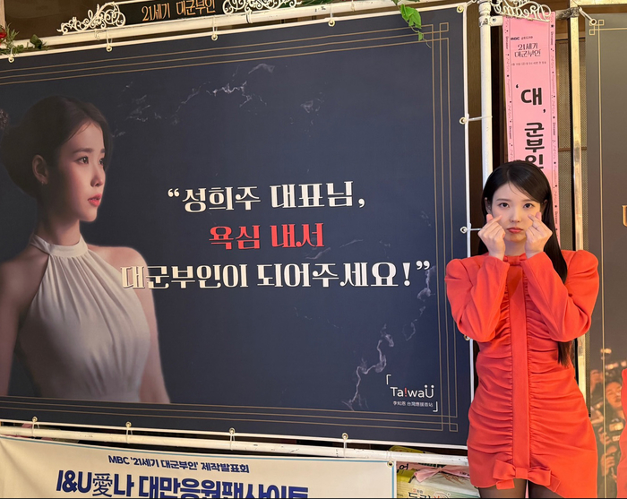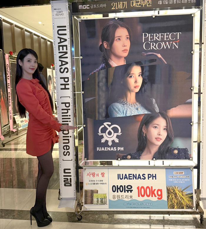 사진 속 아이유는 극 중 캐릭터인 ‘성희주’를 연상시키는 화사한 오렌지 레드 컬러의 미니 원피스를 입고, 팬들이 보내준 쌀 화환과 응원 배너 앞에서 다양한 포즈를 취하고 있다.