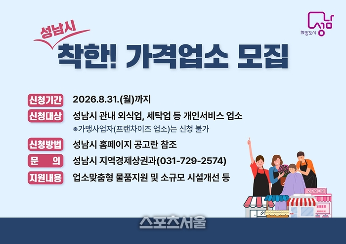 〔스포츠서울│성남=좌승훈기자〕경기 성남시는 고물가 상황 속 물가 안정에 기여하고 있는 ‘착한가격업소’를 모집한다.
