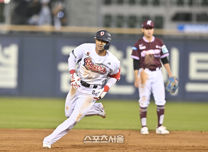 두산 강승호가 8일 서울 잠실구장에서 열린 2026 KBO리그 키움전 4회말 1사2루 1타점 중전안타를 친 후 상대 실책을 틈 타 3루까지 진루하고 있다.