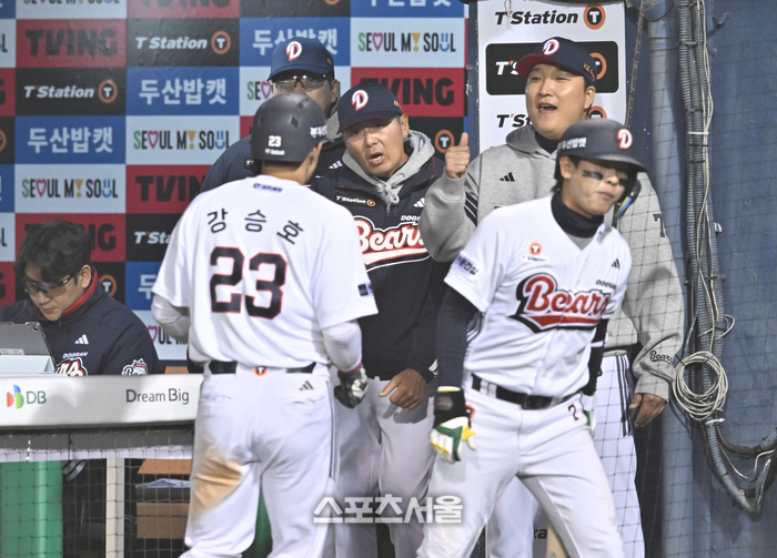두산 김원형 감독이 8일 서울 잠실구장에서 열린 2026 KBO리그 키움전 4회말 1사3루 윤준호 희생타 때 홈을 밟은 강승호와 하이파이브를 하고 이다.