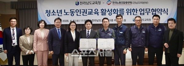 [스포츠서울∣조광태기자] 전라남도교육청(교육감 김대중)은 지난 8일 청사 5층 비즈니스실에서 한국노동조합총연맹 전남본부와 ‘청소년 노동인권 보호·증진’을 위한 업무협약을 체결했다.
