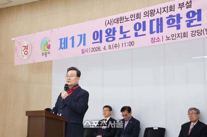 〔스포츠서울│의왕=좌승훈기자〕김성제 의왕시장은 8일 대한노인회 의왕시지회 강당에서 열린 제1기 노인대학원 입학식에서 “그동안 지역사회의 든든한 버팀목이 되어주신 어르신들이 이제는 자신을 위한 배움과 여유를 누리시길 바란다”며 “노인대학원이 어르신들의 삶에 새로운 설렘과 활력을 불어넣는 공간이 되도록 적극 지원하겠다”고 말했다.