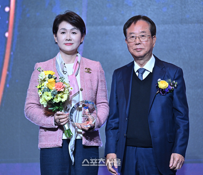 동아오츠카 이진숙 전무가 9일 그랜드 인터컨티넨탈 서울 파르나스에서 열린 2025-2026 프로농구 시상식에서 공로상을 받은 후 KBL 이수광 총재와 기념촬영을 하고 있다.
