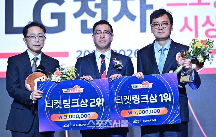 창원 LG와 안양 정관장이 9일 그랜드 인터컨티넨탈 서울 파르나스에서 열린 2025-2026 프로농구 시상식에서 티켓링크상을 수상한 후 NHN링크 유현종 이사와 기념촬영을 하고 있다.