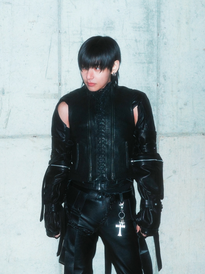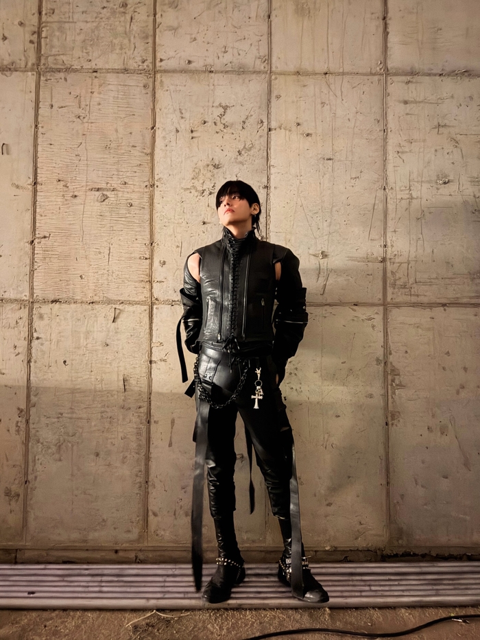 공개된 사진 속 뷔는 전신을 감싸는 블랙 가죽 의상을 입고 파격적인 스타일링을 선보였다. 그는 거친 콘크리트 벽을 배경으로 날카로운 눈빛을 발산하며 압도적인 아우라를 뿜어냈다. 특히 가죽 마스크와 독특한 헤드 기어를 착용한 모습은 마치 영화 속 한 장면 같은 몽환적이면서도 강인한 분위기를 자아냈다.