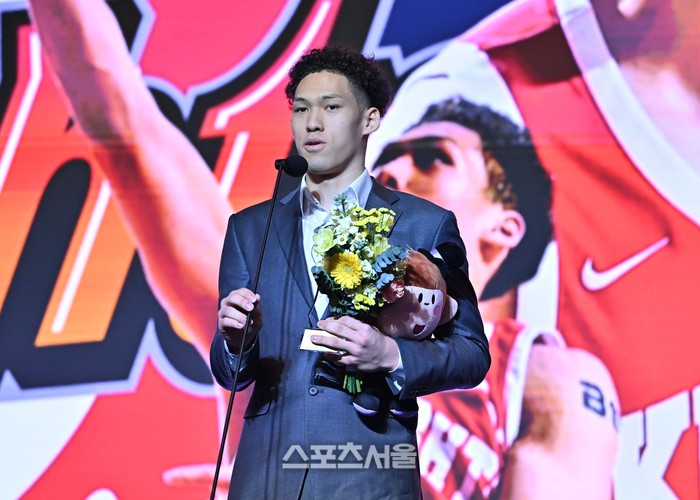 SK 에디 다니엘이 9일 그랜드 인터컨티넨탈 서울 파르나스에서 열린 2025-2026 프로농구 시상식에서 식스맨상을 수상 후 소감을 말하고 있다.