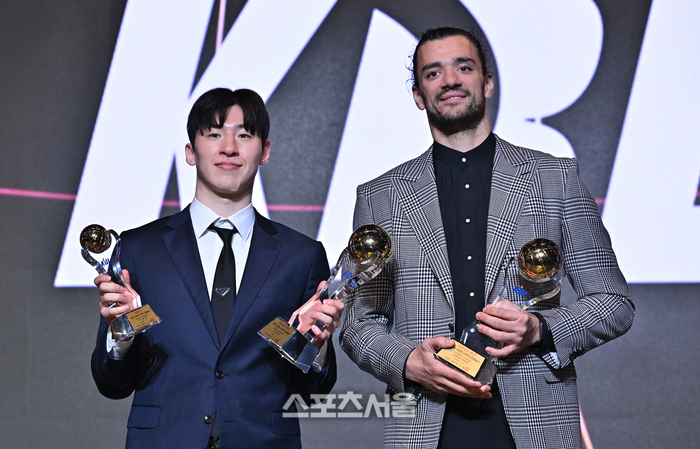 국내선수 MVP 고양 소노 이정현(왼쪽), 외국선수 MVP 아셈 마레이가 9일 그랜드 인터컨티넨탈 서울 파르나스에서 열린 2025-2026 프로농구 시상식에서 포즈를 취하고 있다.